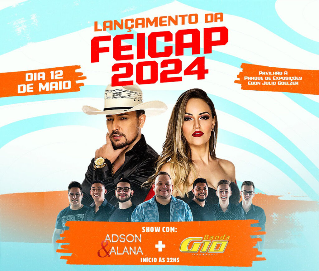 Ingressos para o lançamento dos shows da FEICAP 2024 já estão à venda.Evento vai acontecer no dia 12 de maio com animação de Adson & Alana e Banda G10.