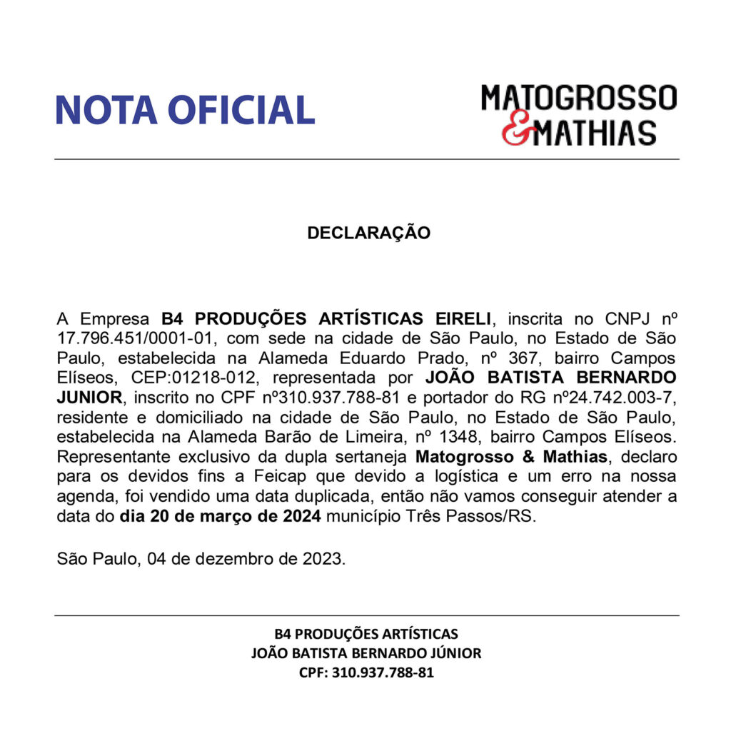 A Empresa B4 PRODUÇÕES ARTÍSTICAS EIRELI, inscrita no CNPJ nº 17.796.451/0001-01, com sede na cidade de São Paulo, no Estado de São Paulo, estabelecida na Alameda Eduardo Prado, nº 367, bairro Campos Elíseos, CEP:01218-012, representada por JOÃO BATISTA BERNARDO JUNIOR, inscrito no CPF nº310.937.788-81 e portador do RG nº24.742.003-7, residente e domiciliado na cidade de […]