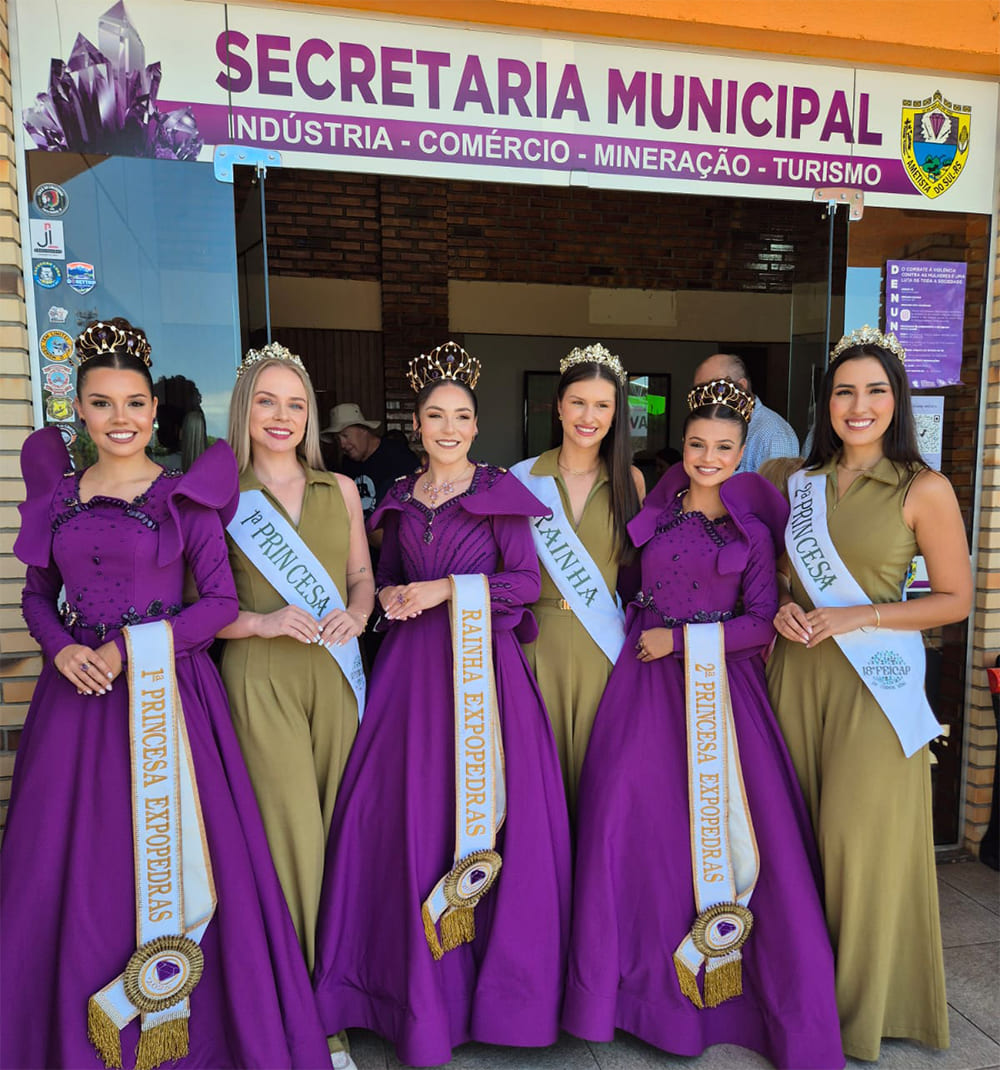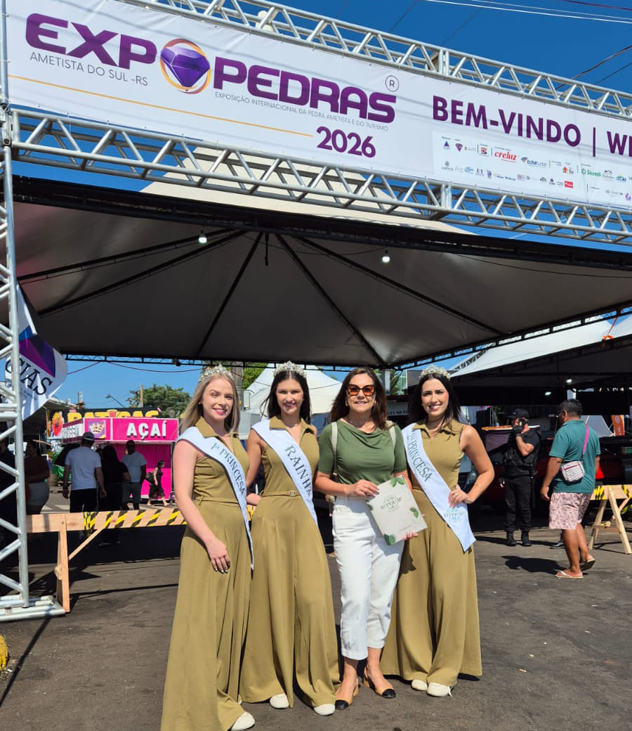 A presidente da 18ª FEICAP, Beatriz Vargas, o coordenador da Comissão de Comunicação e Marketing Carton Cardoso e as soberanas estiveram em Ametista do Sul no dia 21 de março, participando da Expopedras — Feira Internacional da Pedra Ametista.